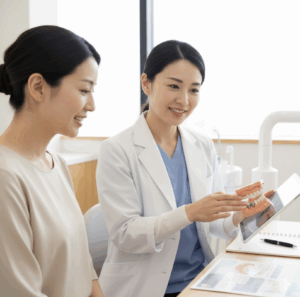 また、仮歯は完成品に向けて都度、調整していくものです。「仮歯が今までより頬や舌に当たる」、「噛み合わせに違和感がある」、「しゃべりにくい」など、仮歯を噛み合わせたときや会話の際に違和感があれば、お伝えください。1つずつ確認していきます。調整した上で、最終的な被せ物が入る時に備えて磨き残しのないようなセルフケアの方法を習得していきましょう。