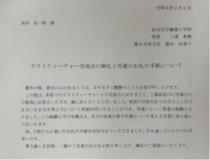 限られた時間の中で、満足いく内容になったかわかりませんが、貴重な機会を頂いた校長先生はじめ、鈴木先生、担任の先生、有賀先生に感謝申し上げます。